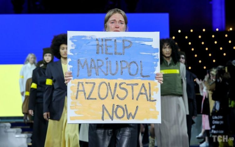 Наприкінці показу Лілія, не стримуючи сліз, вийшла на подіум із плакатом, де на жовто-блакитному тлі було написано “Help Mariupol Azovstal now”.