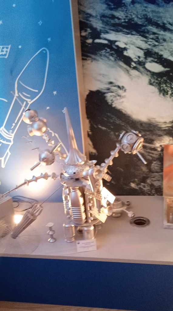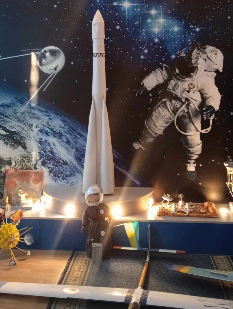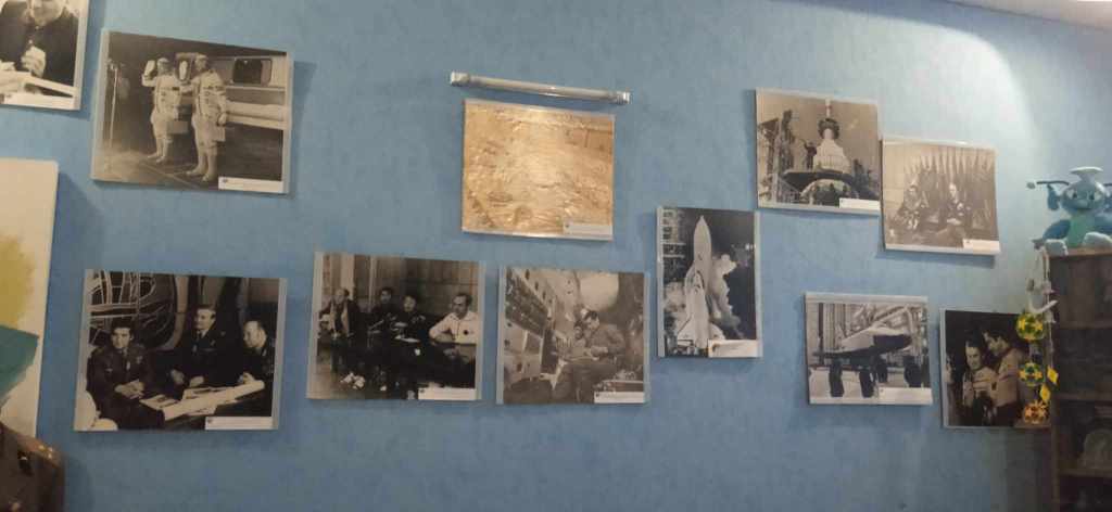 Як відомо, авіація – старша сестра космонавтики. Тому в музейній залі, наповненій речами і зображеннями на космічну тематику, все ж таки першочергово привертають увагу моделі двох літачків, розміщених у центрі головної експозиції, прямо на підлозі. А потім, звісно ж, присутні поринають в атмосферу космосу. Портрети і фото відомих підкорювачів космосу – до речі, деякі знімки є раритетними, з автографами космонавтів, парашут, різноманітні деталі космічної ракети і навіть шматок обшивки з неї, різні цікаві міні-експозиції, книги… На стінах – майстерно зображені люки, що створює відчуття перебування всередині ракети.
